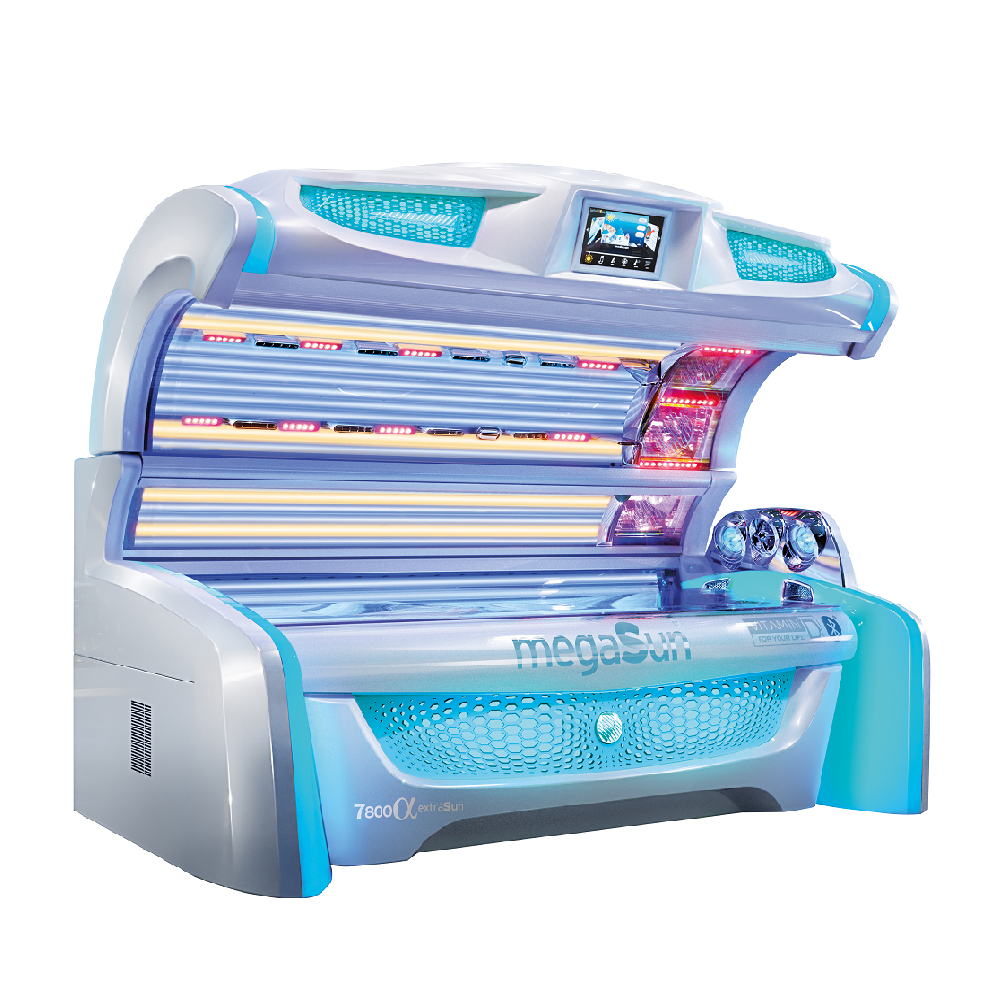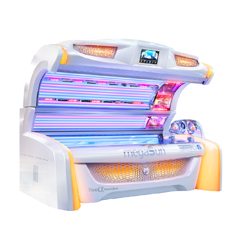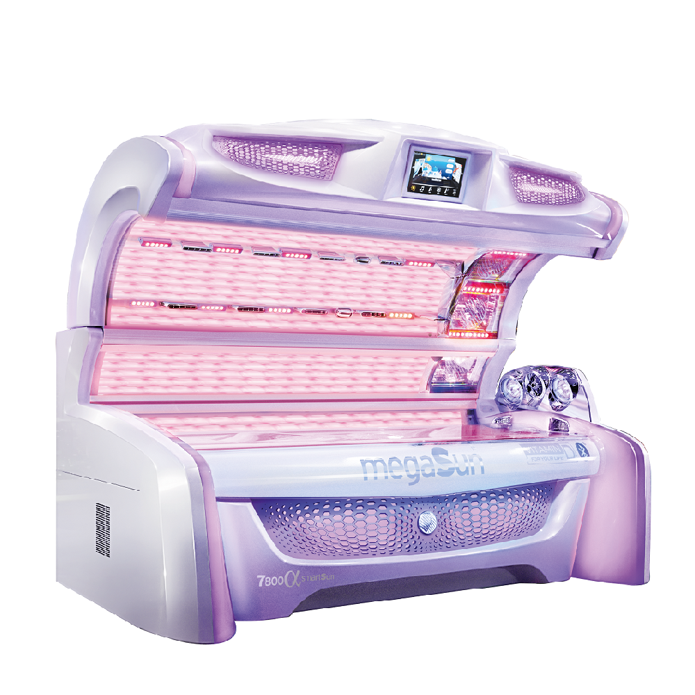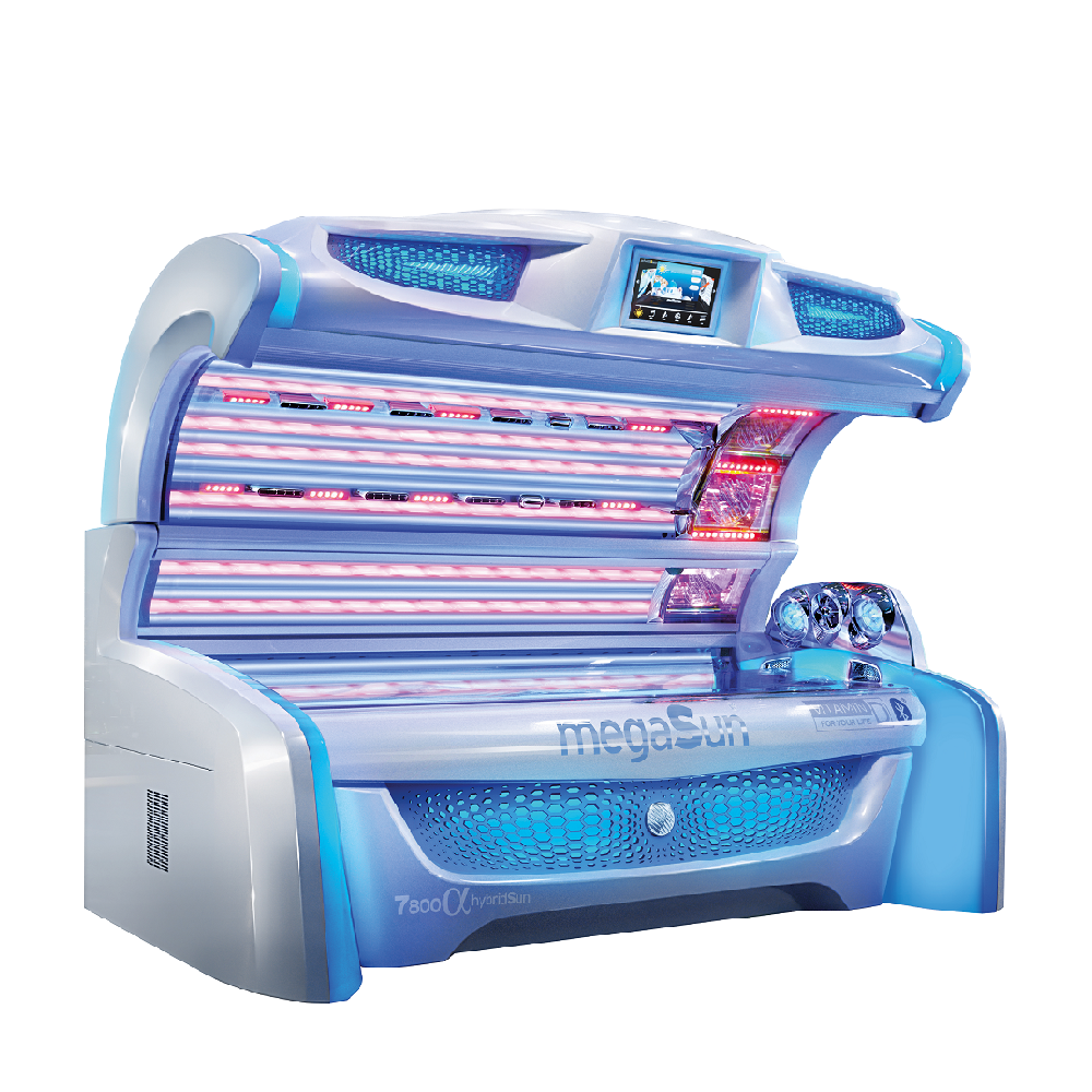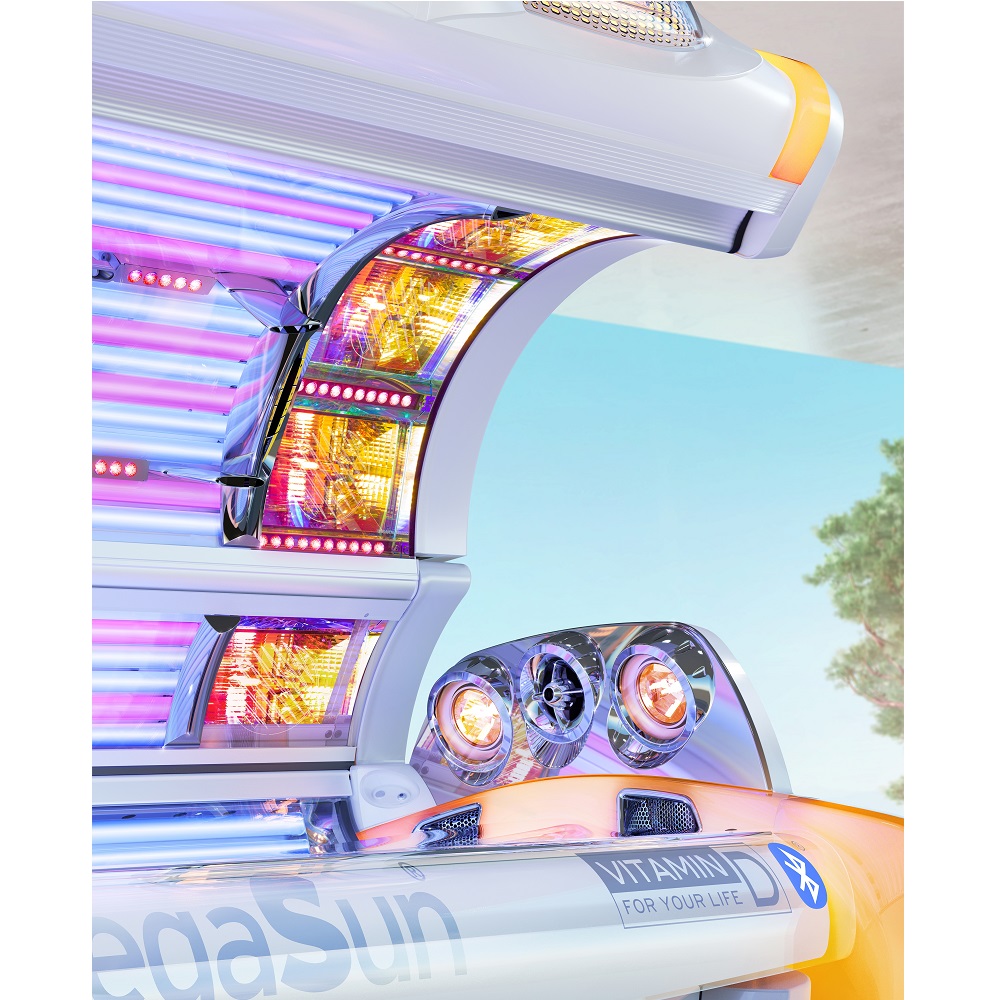 Jaunais solārijs Megasun 7800 iemieso mūsdienīgu stilu un ievēro jutekliskas skaidrības principu — un tas ir pārsteidzoši viegli. Piecdesmit ķermeņa lampas nodrošina intensīvu iedegumu, bet septiņdesmit HyperRed Beauty Boosters nodrošina svaiguma palielinājumu dekoltē zonai un kājām. Varat izvēlēties kādu no četriem Megasun 7800 variantiem: hybridSun, extraSun, smartSun un beautySun.